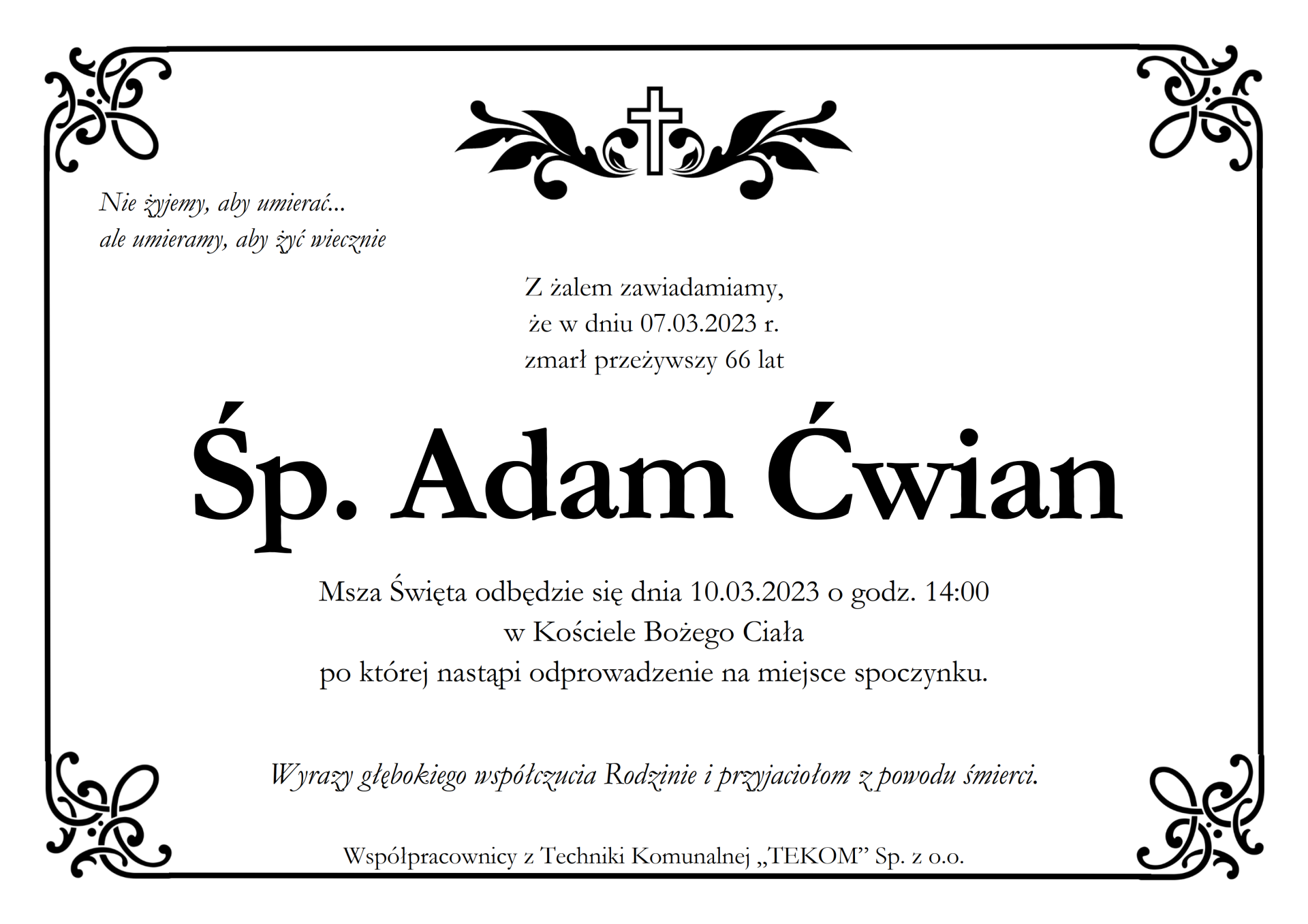 rodzinie i bliskim zmarłego składają wyrazy współczucia,